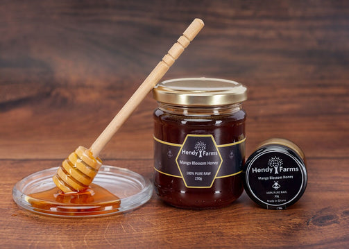Hendy Farms Mango Blossom Honey is sustainably harvested from honey produced Hendy Farms mango flowers. A natural sweetener that is great on oatmeal, hot quinoa cereal, toast, beverages, even when cooking fish! Also can be used in baking. An apiary on a mango fruit farm.