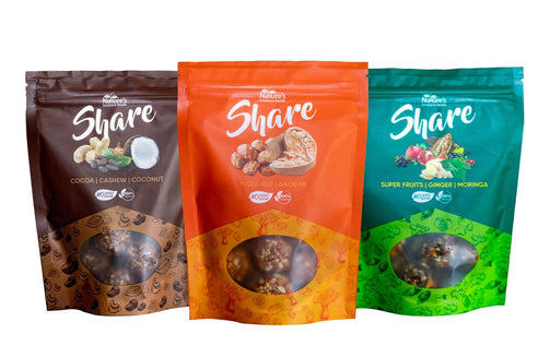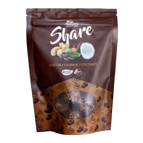 Cocoa Cashew Coconut: Pure Oats (gluten free), Cashew, Cocoa Powder, Coconut, Pineapple, Vitamin E Oil, Honey and Brown Rice Syrup.