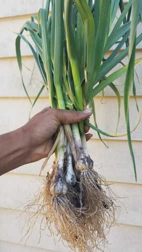 We didn't make time to cure ours so you will be receiving your garlic about 1 day to 1 week post harvest date. Feel free to cure them yourself by hanging them to air dry in a dark dry place with plenty of air or eat them fresh as is. All parts of the garlic can be used in a way. Roots will be trimmed but not completely removed. We had to harvest our garlic early due to unforseen circumstances so the bulbs are very small. Still the same great taste. $8/bunch. About a 1lb bunch.